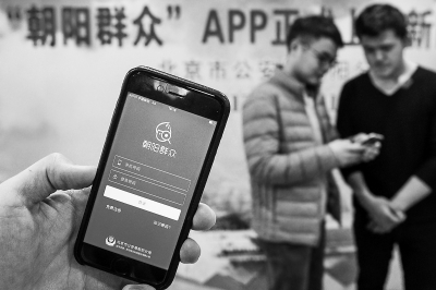 昨天,在北京市公安局朝陽分局舉行的新聞發(fā)布會(huì)后,市民體驗(yàn)“朝陽群眾”APP。記者 鄧偉攝