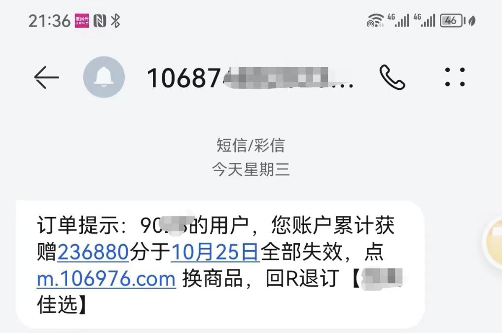 北京一位消費(fèi)者日前收到的“積分兌換”短信。