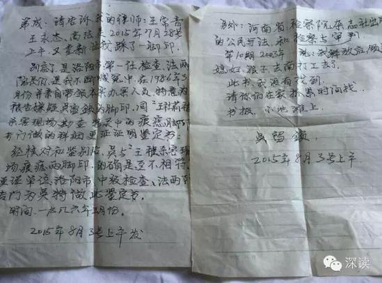 兩封信中敘述到,“河南省高級(jí)人民法院于2015年7月28號(hào)上午11時(shí)親自來到河南省第四監(jiān)獄提審我,又重新讓我踩了一次腳印。隨后,2015年10月23日,河南省高級(jí)人民法院和洛陽(yáng)市公安局技術(shù)鑒定科又一次將我提出監(jiān)獄,在監(jiān)獄大門口路南邊的野地半坡上,又重新讓我踩了石膏模擬腳印?!?/p>
