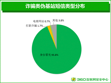 安全人員對詐騙類偽基站短信內(nèi)容進(jìn)行篩選和分析發(fā)現(xiàn),身份冒充類偽基站短信占到了絕大部分,占比為93.8%,打款詐騙(1.7%)、電商網(wǎng)站(0.7%)位列其后。