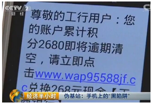 近日央視報(bào)道了湖北警方破獲的一系列短信詐騙案件。案件中,犯罪嫌疑人利用偽基站不定向向群眾發(fā)送冒充銀行的詐騙短信,通過發(fā)送有關(guān)積分兌換的信息騙取受害人的支付驗(yàn)證碼,轉(zhuǎn)走受害人銀行卡內(nèi)的5000元錢。安全專家提醒,偽基站欺詐短信猖獗,已成近幾年對用戶財(cái)產(chǎn)危害最大的欺詐類型,用戶需注意防范。