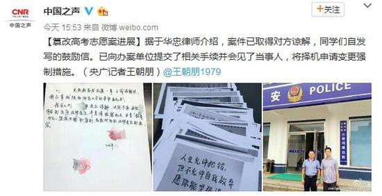 備受關(guān)注的山東青島膠州高三畢業(yè)生常升高考志愿被 同學(xué)郭某某篡改一事有最新進(jìn)展。案件已取得對方諒解,同學(xué)們自發(fā)寫鼓勵信。已向辦案單位提交了相關(guān)手續(xù)并會見了當(dāng)事人,將擇機(jī)申請變更強(qiáng)制措施。(來源:中國之聲)