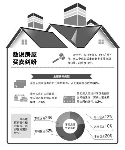 市二中院調(diào)研發(fā)現(xiàn),部分以入學(xué)為主要目的的購(gòu)房者,因房屋實(shí)際情況等種種原因無(wú)法落戶(hù),或因?qū)W籍使用限制等原因無(wú)法確保入學(xué)資格,導(dǎo)致購(gòu)房目的無(wú)法實(shí)現(xiàn)從而產(chǎn)生糾紛。數(shù)據(jù)顯示,涉及西城區(qū)案件數(shù)量占案件總數(shù)的32%。