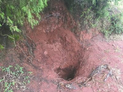 順著吳大爺?shù)闹敢?,記者穿過一片蘆葦?shù)兀麠l山路雜草叢生,無路可尋。在山頂?shù)囊豢冒貥湎拢浾哒业搅耸w被埋處,一個約半米深、寬半米的泥坑,樹根裸露在外,周圍新翻的泥土掩蓋了雜草。現(xiàn)場還有警方取證時留下使用過的一次性手套。