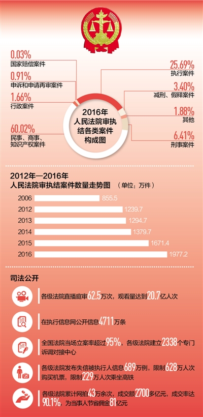 2016年,最高法健全審判流程、庭審活動、裁判文書、執(zhí)行信息四大公開平臺,進(jìn)一步拓展司法公開的廣度和深度,讓人民群眾看得見、感受到公平正義。最高法自去年7月1日起所有公開開庭案件都上網(wǎng)直播,各級法院直播庭審62.5萬次,觀看量達(dá)到20.7億人次。截至今年2月底,中國裁判文書網(wǎng)公開裁判文書超過2680萬份,訪問量突破62億人次,覆蓋210多個國家和地區(qū),成為全球最有影響的裁判文書網(wǎng)。