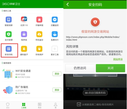 第五,使用360手機衛(wèi)士等安全管理軟件,通過安全掃碼功能掃描二維碼,識別釣魚網(wǎng)站以及手機木馬,保護手機安全不中招。