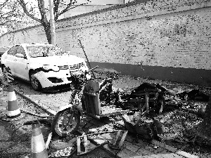 昨日,北京晨報記者來到酒仙橋二街坊附近,在1號樓樓下聚著一群人,正在討論凌晨爆炸的事情,“簡直就是個移動隱患”,“還好不是白天,不然肯定有人受傷”。記者看到,一輛綠色三輪車嚴重損毀,車輪扭曲倒在地上,車身部分被炸成了一張橫鋪著的大鐵皮,經過灼燒后變得焦黑。三輪車的部分零件丟失,旁邊的樹上掛著鐵條,十幾米外的墻邊散落著三輪車的架子,而車輛原本放置電瓶的地方空無一物。在三輪車旁,一個大煤氣罐被炸成三部分,中間圓筒狀變成一塊鋪展后約1平方米的厚鐵皮,上下兩端則變成兩個圓形的蓋子(如圖)。