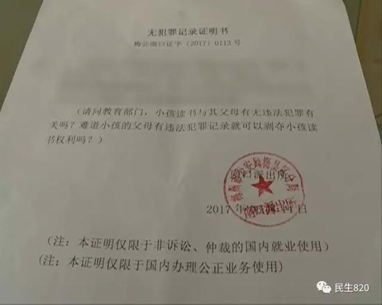 在派出所開具的證明書的中間打了括號(hào),里面寫著:“請(qǐng)問教育部門,小孩讀書與其父母有無犯罪有關(guān)嗎?難道小孩的父母有違法犯罪記錄,就可以剝奪小孩讀書權(quán)利嗎?”