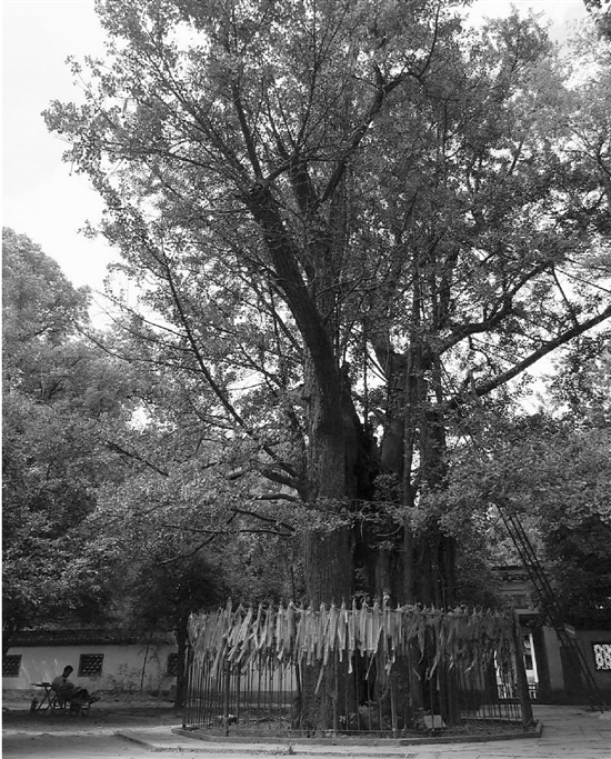 記者專程去西湖邊的五云山,去看山頂那棵杭州最古老的樹(shù),1400多年的銀杏。爬上山,在山頂一眼望過(guò)去,就是那棵古老的銀杏,四周?chē)鷻谏舷禎M了紅色的祈福飄帶。20多米高的樹(shù)干和巨大的樹(shù)冠讓樹(shù)蔭下乘涼的人顯得很小。樹(shù)后面就是真際寺,里面小賣(mài)部的老板說(shuō),天天都有人跑來(lái)看這棵樹(shù),再等幾個(gè)月,秋天銀杏葉黃的時(shí)候,別提多好看了。