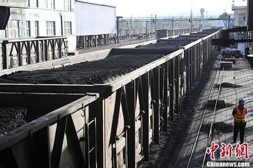 資料圖:煤礦貨運(yùn)站一列滿(mǎn)載即將外銷(xiāo)煤炭的列車(chē)。中新社記者 韋亮 攝