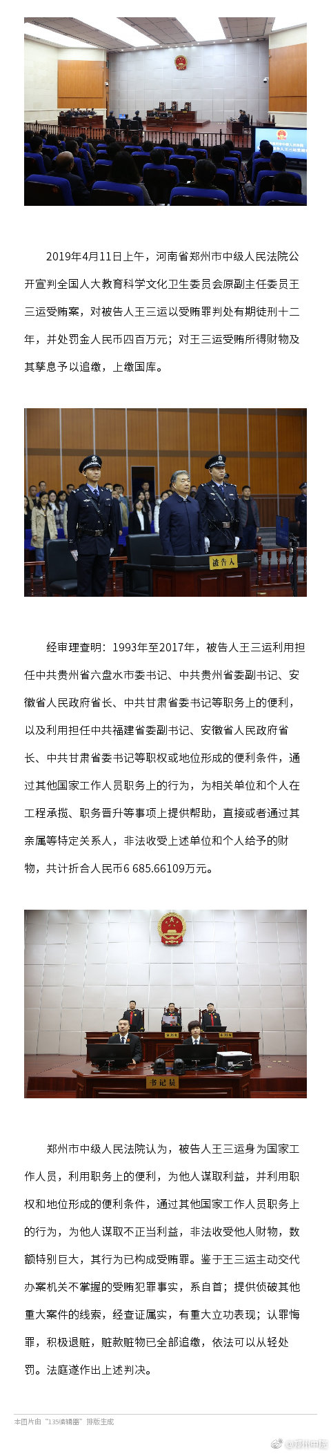 人民網(wǎng)北京4月11日電 據(jù)鄭州市中級人民法院官方微博消息,2019年4月11日上午,河南省鄭州市中級人民法院公開宣判全國人大教育科學(xué)文化衛(wèi)生委員會原副主任委員王三運(yùn)受賄案,對被告人王三運(yùn)以受賄罪判處有期徒刑十二年,并處罰金人民幣四百萬元;對王三運(yùn)受賄所得財(cái)物及其孳息予以追繳,上繳國庫。