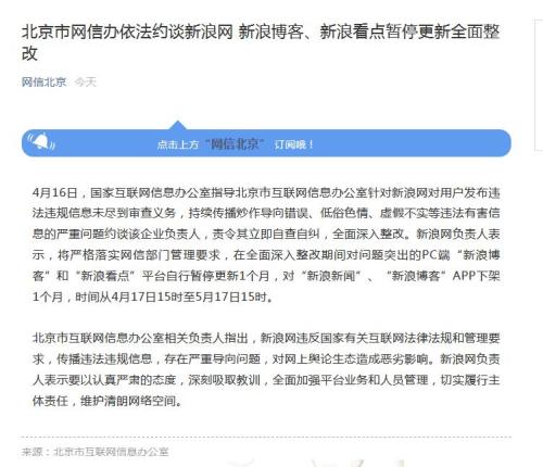 新浪網(wǎng)負責(zé)人表示,將嚴格落實網(wǎng)信部門管理要求,在全面深入整改期間對問題突出的PC端“新浪博客”和“新浪看點”平臺自行暫停更新1個月,對“新浪新聞”、“新浪博客”APP下架1個月,時間從4月17日15時至5月17日15時。