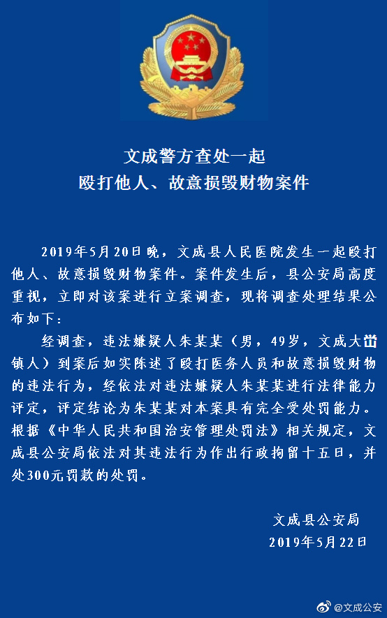 中新網(wǎng)5月23日電 22日,浙江溫州文成縣公安局官方微博針對“國家公職人員朱某某毆打兒科主任”事件發(fā)布警情續(xù)報,文成縣公安局依法對朱某某違法行為作出行政拘留15日,并處300元罰款的處罰。