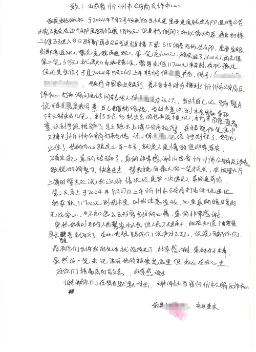 10月9日,忻州市公安局反詐中心收到了受害人親筆寫下的感謝信,信中表達(dá)了對(duì)忻州反詐民警真誠而濃厚的謝意。