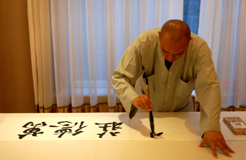 利用閑暇,筆者與行腳僧進(jìn)行了簡單溝通,了解到法師來自廣東省韶關(guān)云門山大覺禪寺,法名圣泰,是云門宗第十五代弟子,酷愛書法,且仰慕五臺山多時,此行特用且行且書的方式了卻多年朝圣心愿。