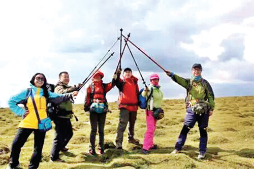 我們不曾相識,一點愛溫暖了人間。從東臺下來,一開始就不見了女兒,還好有閨蜜在身邊談天說地,偶爾“龍哥”擦身而過扔下一句笑話,轉(zhuǎn)眼就不見了蹤影;劉教授常跑國外,腿很長,頭戴禮帽,不用登山杖,腳步輕盈;“大師兄”人見人愛,他的腰間掛一個袋子,是用來裝路上撿到的水瓶、塑料袋、果皮等垃圾的,他身上的雨衣、登山杖好像是給大伙準(zhǔn)備的,誰需要就送給誰;郭大律師看見剛從山下上來,上氣不接下氣、氣喘不停的同行人,忙把自己的雨衣翻過來鋪在大石頭上讓人坐?!吧裢取笨偸窃陉犖榈淖詈螅湓诤竺娴娜?,只要看見“神腿”就信心倍增,和“神腿”合張影,比出個“二”的手勢,仿佛自己也是“神腿”了。吳老師人很好,熱情地幫我拍了一張“打坐”的美照,真可謂不懂?dāng)z影的老師不是優(yōu)秀企業(yè)家;見到海濤群主不時從山上往山下跑,照顧落在后面的人;又遇見一位腰間掛垃圾袋的人,他走近一頭正在喂奶的母牛,像老朋友一樣輕輕地?fù)崦@牛的頭部,聽說他是講國學(xué)的馬老師。佛家講的是一種緣分,有緣自然來相會,我和馬老師聊著爬上了一個山頭,心頭一怔,馬老師不就是我們的學(xué)問大咖嗎?我們的八月大朝臺隊伍里藏龍臥虎,稍不留神,大咖就會從你身邊溜走。正說著,閨蜜劉老師從我身邊經(jīng)過,腰間掛著一袋子垃圾,直向前面一個易拉罐追去……
