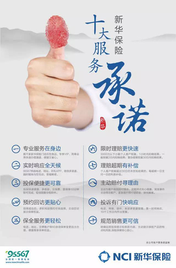 數(shù)十萬(wàn)新華人滿懷誠(chéng)意向您莊嚴(yán)宣誓“十大服務(wù)承諾”,竭誠(chéng)為您提供便捷、專(zhuān)業(yè)的保險(xiǎn)金融服務(wù)!