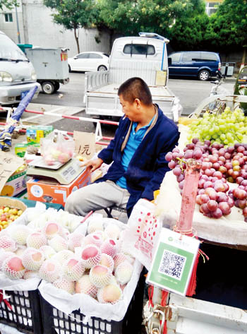 7月30日,位于和平街市中級(jí)人民法院旁的便民市場(chǎng)上,一位水果商販正在出售水果。三輪車(chē)上掛著微信支付二維碼,告訴顧客可以用手機(jī)掃一掃買(mǎi)水果。小販說(shuō):“現(xiàn)在用手機(jī)支付的人越來(lái)越多,特別是年輕人。手機(jī)支付,不用找零,不怕假幣,‘掃一掃’,就是好!”