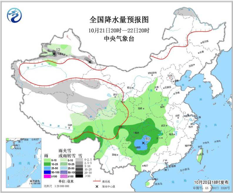 10月20日20時至21日20時,新疆北疆北部和西部、青海南部、西藏北部、內(nèi)蒙古東北部、黑龍江西北部等地的部分地區(qū)有小到中雪或雨夾雪,其中,北疆北部山區(qū)有大到暴雪(10~18毫米)。西藏東南部、陜西南部、四川盆地東部、重慶大部、貴州北部等地的部分地區(qū)有中到大雨(10~40毫米)。內(nèi)蒙古東部、東北地區(qū)北部、新疆北部、西藏北部等地的部分地區(qū)有4~6級風(fēng),新疆山口風(fēng)力可達10級左右(見圖1)。