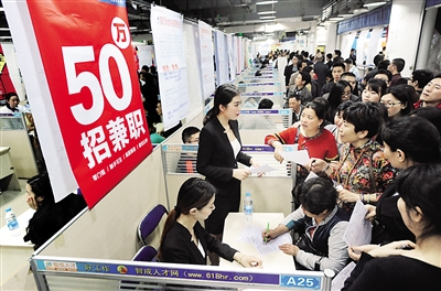 23日上午11點(diǎn),重慶市江北區(qū)觀音橋一家人才招聘市場內(nèi),一個(gè)掛著“五十萬招兼職”海報(bào)的招聘展位前人頭攢動(dòng)。排隊(duì)等候填表報(bào)名的人將兩米寬的過道塞得滿滿當(dāng)當(dāng)。