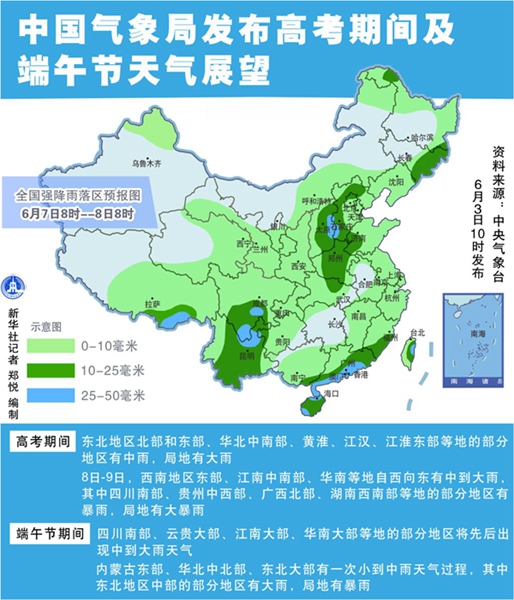 新華社北京6月3日電(記者于文靜、林暉)今年高考期間(6月7日至9日),我國中東部地區(qū)無明顯高溫天氣,大部地區(qū)有陣雨或雷陣雨天氣。端午節(jié)期間(6月9日至11日),四川南部、云貴大部、江南大部、華南大部等地的部分地區(qū)將先后出現(xiàn)中到大雨天氣。