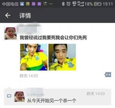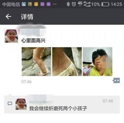 朋友圈圖片顯示:男孩受傷嚴(yán)重,眼睛被打腫,大小腿有多處傷痕。圖片轉(zhuǎn)自另一男子,最讓人覺得不可理喻的是,該男子不僅在朋友圈曬出孩子被打傷的圖片,還配文稱“心里面高興”、“我會(huì)繼續(xù)折磨死兩個(gè)小孩子”。另外還搭配自拍照稱“我曾經(jīng)說過我要死我會(huì)讓你們先死”并跟帖“從今天開始見一個(gè)殺一個(gè)”。