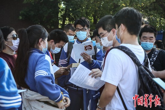 7月7日上午,北京市中國(guó)人民大學(xué)附屬中學(xué)朝陽(yáng)學(xué)校(東校區(qū))門口,考生們?cè)谶M(jìn)入考場(chǎng)前抓緊時(shí)間看復(fù)習(xí)資料。中青報(bào)·中青網(wǎng)見(jiàn)習(xí)記者 孔斯琪/攝