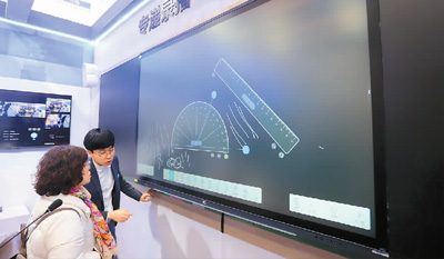 觀眾在首屆江蘇(蘇州)教育裝備展上參觀智慧黑板。王建康攝(人民圖片)