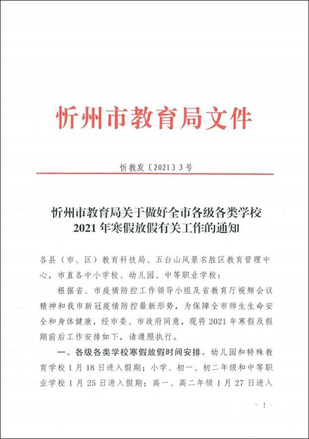 根據(jù)省、市疫情防控工作領(lǐng)導(dǎo)小組及省教育廳視頻會議精神和我市新冠疫情防控最新形勢,為保障全市師生生命安全和身體健康;經(jīng)市委、市政府同意,現(xiàn)將2021年寒假及假期前后工作安排如下,請遵照執(zhí)行。