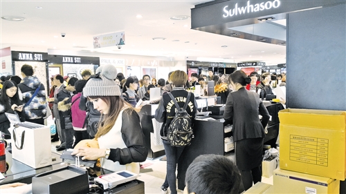 “雪花秀”品牌作為愛茉莉太平洋旗下的高檔化妝品品牌在中國游客中頗具人氣。圖為樂天免稅店首爾小公洞店“雪花秀”專柜,等待購物的顧客排起了20米長隊(duì),其中絕大多數(shù)都是中國游客。本報(bào)駐首爾記者 楊 明攝