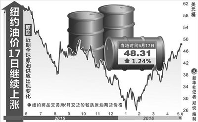 近期,國際原油價格屢現(xiàn)攀升,逼近每桶50美元。5月17日,截至當(dāng)日收盤,紐約商品交易所6月交貨的輕質(zhì)原油期貨價格上漲0.59美元,收于每桶48.31美元,漲幅為1.24%。7月交貨的倫敦布倫特原油期貨價格上漲0.31美元,收于每桶49.28美元,漲幅為0.63%。分析認為,一些突發(fā)因素導(dǎo)致了近期油價攀升,國際油市實現(xiàn)供需平衡仍需時日。
