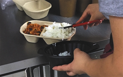 到下午三點多,這些成品菜會從加熱機中撈起,如果有人訂餐,就再放進微波爐里加熱。賣不完的成品菜,晚上放入冷藏柜里,等第二天循環(huán)加熱,直到下一位顧客買走它。