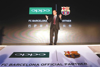 去年9月8日,西甲巴塞羅那俱樂部與OPPO手機在北京召開聯(lián)合新聞發(fā)布會,宣布自2015-2016賽季開始,OPPO正式成為巴塞羅那俱樂部官方合作伙伴。圖為巴塞羅那俱樂部副主席佩雷斯在新聞發(fā)布會上致辭。 新華社記者 李 穎攝