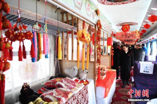 1月13日,春運(yùn)首日,蘭州鐵路局蘭州客運(yùn)段擔(dān)當(dāng)?shù)腪6207次列車(chē)上設(shè)立“年貨超市”吸引旅客。中新社記者 楊艷敏 攝