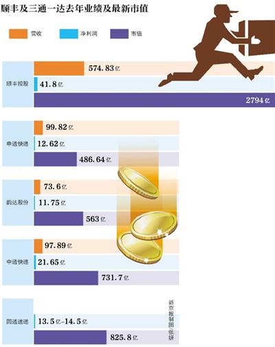 從中可以看出,順豐歸屬凈利潤總額是申通的3.3倍,是韻達的3.55倍,但從凈利潤率指標看,順豐只有7.2%,而韻達是15.96%,申通是12.64%,中通是22.1%。而從市值看,順豐市值已超三通一達之和。