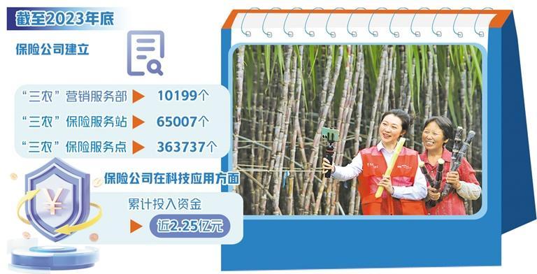 科技的運用也有效推動保險業(yè)服務(wù)農(nóng)村。中國保險行業(yè)協(xié)會發(fā)布的《保險業(yè)高質(zhì)量服務(wù)鄉(xiāng)村振興藍皮書(2024)》顯示,保險業(yè)有效提升了縣域和農(nóng)村機構(gòu)網(wǎng)點覆蓋率,截至2023年底,保險公司建立“三農(nóng)”營銷服務(wù)部10199個,“三農(nóng)”保險服務(wù)站65007個,“三農(nóng)”保險服務(wù)點363737個。2023年,保險公司在科技應(yīng)用方面累計投入資金近2.25億元,主要用于空間信息技術(shù)、AI識別、人工智能、物聯(lián)網(wǎng)等科技手段應(yīng)用,構(gòu)建農(nóng)業(yè)生產(chǎn)、風險信息數(shù)據(jù)共享平臺。
