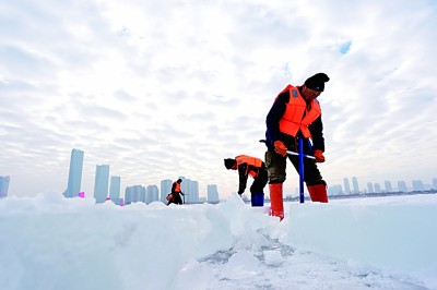 工人在黑龍江哈爾濱冰雪大世界采冰現(xiàn)場作業(yè)。新華社發(fā)