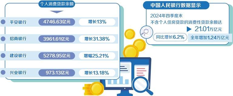 2024年,上市銀行零售業(yè)務(wù)普遍進入調(diào)整期,消費貸業(yè)務(wù)增長強勁。在擴內(nèi)需、促消費的背景下,消費貸成為零售業(yè)務(wù)的新增長點。中國人民銀行數(shù)據(jù)顯示,2024年四季度末,不含個人住房貸款的消費性貸款余額達21.01萬億元,同比增長6.2%,全年增加1.24萬億元。多家銀行在2024年年報中披露的個人消費貸款數(shù)據(jù)有明顯增長。其中,平安銀行個人消費貸款余額4746.63億元,同比增長13%;招商銀行個人消費貸款余額3961.61億元,較上年末增長31.38%;中國農(nóng)業(yè)銀行含信用卡在內(nèi)的個人消費貸款余額1.3萬億元,新增2943億元,增速28.3%;中國建設(shè)銀行境內(nèi)個人消費貸款余額5278.95億元,增幅25.21%;興業(yè)銀行個人消費貸款余額973.13億元,較上年末增長13.18%。南開大學金融學教授田利輝表示,隨著國家提振消費政策的出臺,銀行零售業(yè)務(wù)有望逐步提速。消費貸業(yè)務(wù)有望在政策支持下繼續(xù)增長,成為銀行重要的利潤來源。