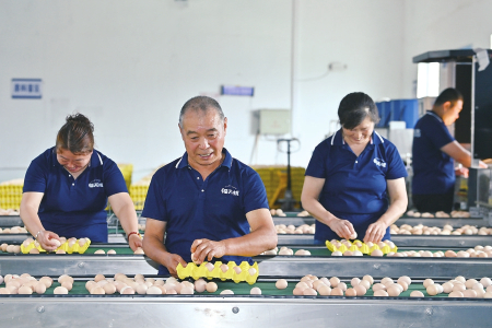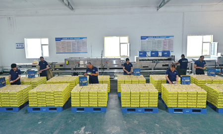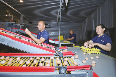雞蛋通過(guò)自動(dòng)分級(jí)機(jī)流向預(yù)先設(shè)定規(guī)格標(biāo)準(zhǔn)的生產(chǎn)線(xiàn),工作人員再將大小一致的雞蛋收集碼盤(pán)。