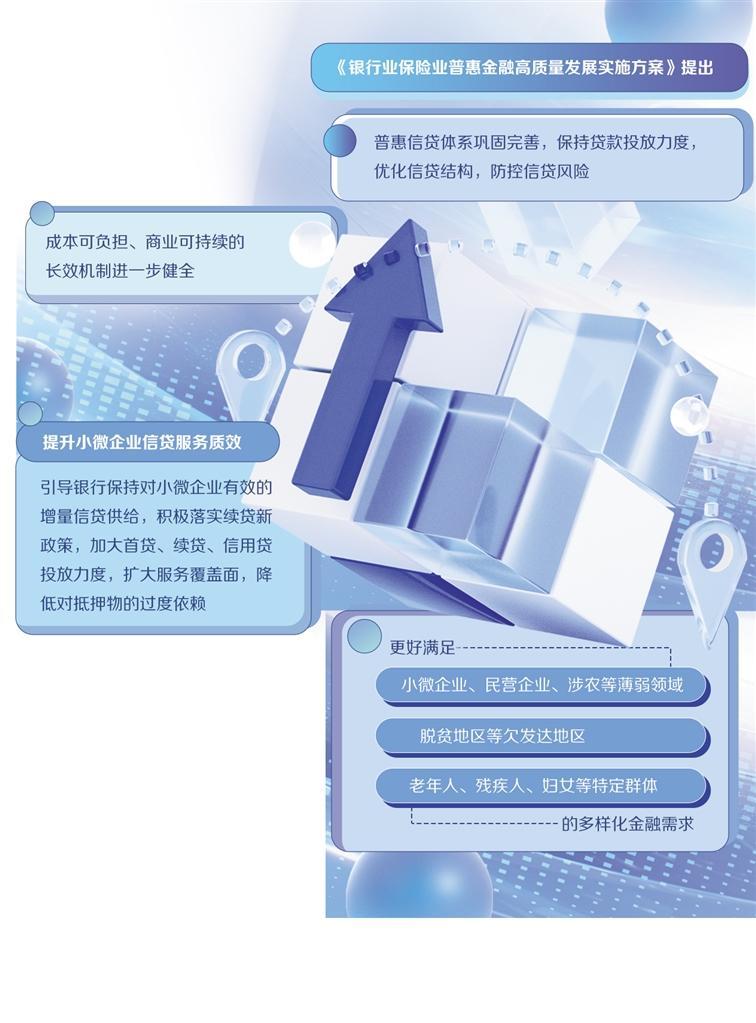 近年來(lái),我國(guó)普惠金融發(fā)展取得長(zhǎng)足進(jìn)步,金融服務(wù)的普惠性不斷提升。近期印發(fā)的《銀行業(yè)保險(xiǎn)業(yè)普惠金融高質(zhì)量發(fā)展實(shí)施方案》(以下簡(jiǎn)稱《實(shí)施方案》)在主要目標(biāo)中提出,普惠信貸體系鞏固完善,保持貸款投放力度,優(yōu)化信貸結(jié)構(gòu),防控信貸風(fēng)險(xiǎn),成本可負(fù)擔(dān)、商業(yè)可持續(xù)的長(zhǎng)效機(jī)制進(jìn)一步健全,更好滿足小微企業(yè)、民營(yíng)企業(yè)、涉農(nóng)等薄弱領(lǐng)域,脫貧地區(qū)等欠發(fā)達(dá)地區(qū)以及老年人、殘疾人、婦女等特定群體的多樣化金融需求。