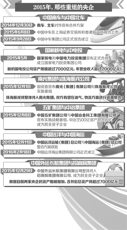 2015年,央業(yè)重組邁出重要步伐。有6對12家企業(yè)完成了重組,涉及至少27家上市公司,一批包括裝備制造、能源、航運(yùn)在內(nèi)的央企實現(xiàn)兼并重組,中央企業(yè)也由112家減至106家。2016年以來,繼1月25日中材集團(tuán)與中建集團(tuán)發(fā)布公告稱實施戰(zhàn)略重組之后,中國國旅集團(tuán)與中國港中旅集團(tuán)也發(fā)布公告稱籌劃戰(zhàn)略重組。此外,中航動力、成發(fā)科技、中航動控三家公司則于日前發(fā)布重組公告。離國務(wù)院國資委直接監(jiān)管的中央企業(yè)數(shù)量減至100家僅有“一步之遙”。