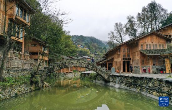 3月18日,在貴州省榕江縣栽麻鎮(zhèn)大利侗寨,村民從月亮山居民宿的小石橋上經(jīng)過(guò)(無(wú)人機(jī)照片)。
