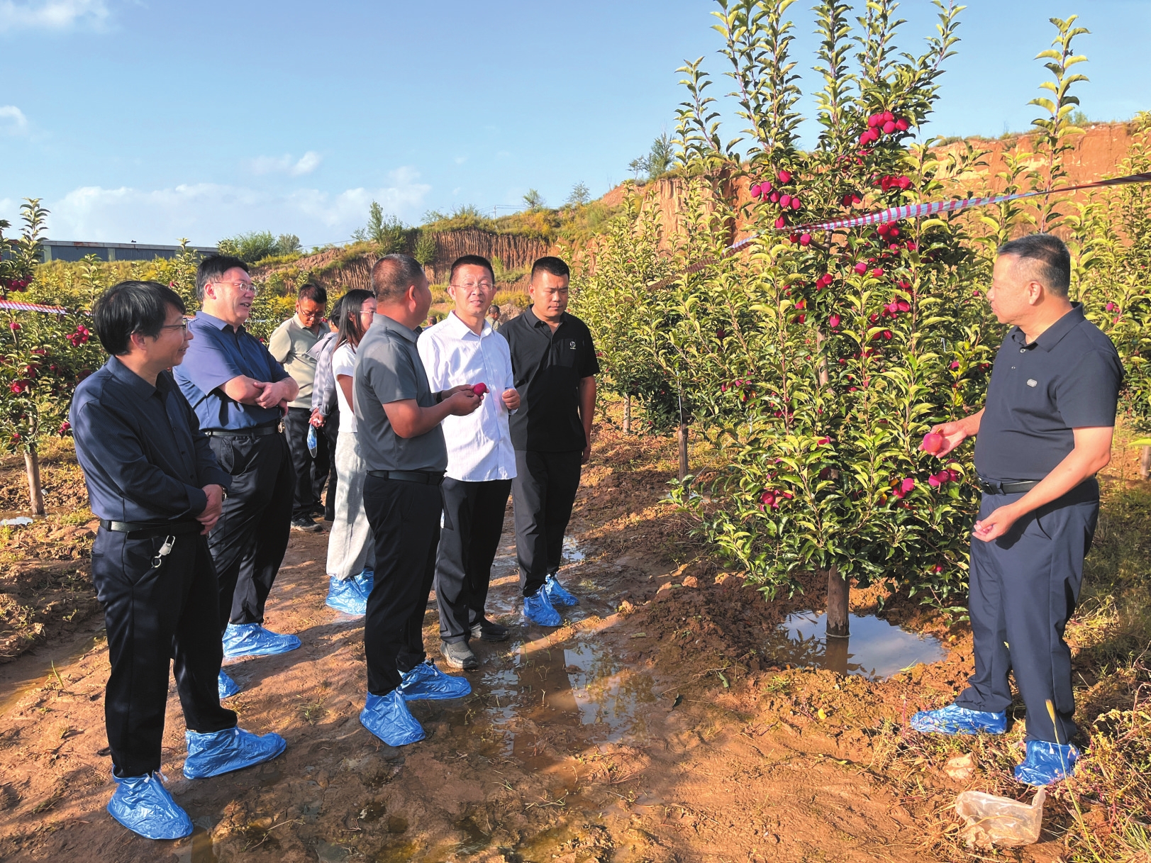 觀摩期間,技術(shù)人員全面介紹了示范果園的建設(shè)背景、關(guān)鍵栽培技術(shù)及主要管理措施,重點(diǎn)講解了河曲紅海棠的品種特性、創(chuàng)新技術(shù)應(yīng)用成效等核心亮點(diǎn)。參會(huì)人員深入田間,實(shí)地察看果樹長勢與掛果情況,并與技術(shù)團(tuán)隊(duì)現(xiàn)場交流,詳細(xì)了解配套栽培措施、季節(jié)性管理要點(diǎn)及該品種在新技術(shù)模式下的實(shí)際生長狀況,進(jìn)一步加深了對對品種優(yōu)勢與技術(shù)推廣成效的認(rèn)識。