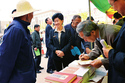 圖為陳義青(中)同參加讀書宣傳活動的群眾交談。 (張銀枝 攝)
