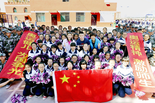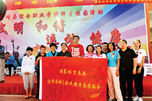 圖為體育健兒與繁峙縣活動現(xiàn)場的同學們合影留念。