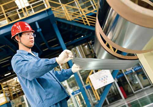 山西堅(jiān)定貫徹落實(shí)習(xí)近平總書記關(guān)于創(chuàng)新驅(qū)動、科教興國、人才強(qiáng)國的重大戰(zhàn)略思想,手撕鋼、碳纖維、碳化硅等技術(shù)創(chuàng)新取得重大突破。圖為太鋼集團(tuán)生產(chǎn)車間正生產(chǎn)手撕鋼。該公司2018年研發(fā)的寬幅精密帶鋼箔材(厚度0.02毫米,寬640毫米)成為世界首創(chuàng),因其厚度不到頭發(fā)直徑的1/3、比A4紙還要薄、可以用手輕易撕開,被形象地稱為“手撕鋼”。 山西省委宣傳部供圖