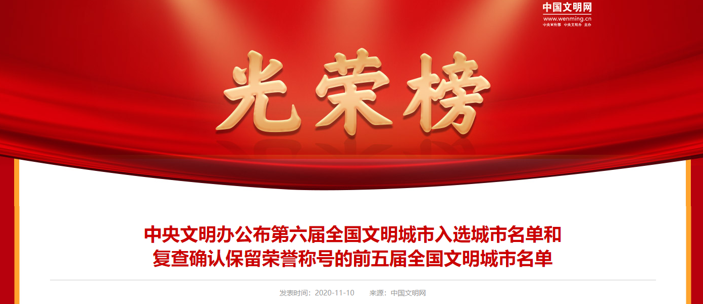 2020年8月以來,中央文明辦按照城市自主申報、省級擇優(yōu)推薦、中央部委審核、媒體集中公示、組織綜合測評、確定入選城市等評選辦法和程序,嚴謹規(guī)范組織第六屆全國文明城市評選工作,嚴格依據參評城市2018、2019、2020年三年測評總成績排名,提出第六屆全國文明城市入選城市名單,報中央文明委領導同志批準。同時,中央文明辦按照城市自查、省級審核、中央把關、組織測評等復查辦法和程序,認真做好前五屆全國文明城市復查工作,嚴格依據全國文明城市復查測評成績,提出繼續(xù)保留榮譽稱號的全國文明城市名單,報中央文明委領導同志批準?,F(xiàn)將第六屆全國文明城市入選城市名單和復查確認保留榮譽稱號的前五屆全國文明城市名單公布如下。