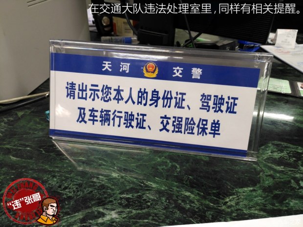 把分?jǐn)?shù)處理完后,心里算是松了一口氣,終于到了最后一步:取證。當(dāng)時(shí)被扣行駛證,我問(wèn)在場(chǎng)的交警除了把違章處理完,還需要帶什么證件過(guò)去。記得他當(dāng)時(shí)的回答是帶上身份證、駕駛證以及行駛證被扣留的憑證即可。所以在確認(rèn)違章完全處理完畢后,我就帶上上述提到的證件和材料去了天河交警大隊(duì)交通違法處理室,可卻無(wú)功而返。