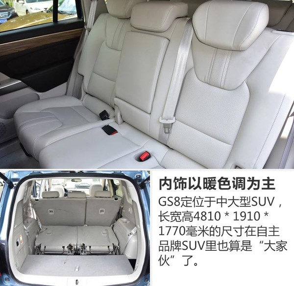 GS8的設(shè)計(jì)由原奔馳設(shè)計(jì)師張帆操刀,在內(nèi)飾部分也較為洞察國內(nèi)消費(fèi)者的喜好。車內(nèi)整體寬敞舒適,顏色采用偏暖的木色,打造一種家用溫馨感??臻g方面,GS8的長寬高分別為4810*1910*1770毫米,軸距2800毫米,采用7座布局。