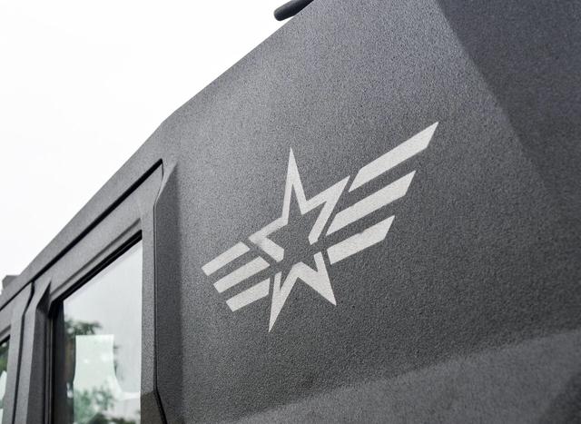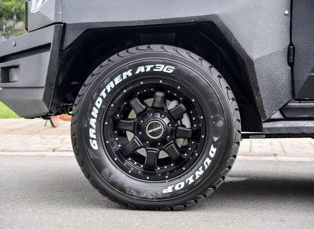 車身表面使用了亞光色涂裝,披上厚重的鋼板并經(jīng)過(guò)高溫噴砂處理,車窗采用了高強(qiáng)度復(fù)合玻璃,厚度比起一臺(tái)iPhone7還要厚。幾乎全車做過(guò)了防彈處理和碳纖維處理,側(cè)面還取消了C柱和D柱,換裝了具有一定防爆能力的輪胎,據(jù)說(shuō)輪胎支持在全部破損的情況下勻速行駛。
